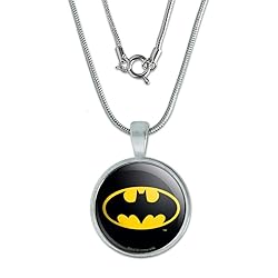 - About The Product: This charming pendant will spruce up any outfit and become your go to favorite accessory! The pendant is sterling silver plated and approximately 0.75" (1.9cm) in diameter with the delightful resin-topped design as shown. The included snake chain is 22" (55.9cm) in length, made from brass and 95.5% sterling silver plated, and closes with a spring ring clasp. About The Design: Batman is a superhero first published by DC Comics in 1939. After witnessing the murder of his parents, Bruce Wayne swore vengeance and trained to fight criminals like The Joker, Catwoman, Penguin, Riddler, Harley Quinn, Poison Ivy, and Bane. If you're a fan you’ll love this official Batman product!
