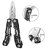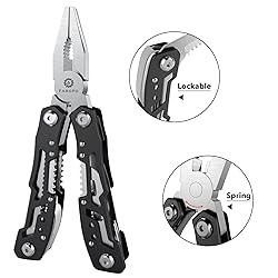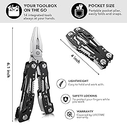14-in-1 Multitool: Multitool with 14 function including pliers heads (long nose pliers, round nose pliers, cutting pliers), sharp knife, philips screwdriver, slotted screwdriver(S), serrated knife, hook remover, double-sided file, slotted screwdriver(L), small scraper, slotted screwdriver(M), can opener and bottle opener. Safety Locking: fangfo Multitool With side lock design, every tool and knife ( except the pliers heads ) will be locked when fully open. Ready for Anything: You never know when you need a screwdriver, plier or knife, etc. This multipurpose tool is a great choice for users to carry in pocket, which is easy to get the correspondant tool in any time. Comprehensive Tool: Utility tool set is perfect for outdoor sports, survival, camping, fishing, hiking as well as hunting. It's durable and sturdy to withstand the wear and tear of everyday use. Lightweight and Portable: With compact size and foldable design, folding utility tool is easy to store or keep in your pocket. This pocket multitool comes with a nylon pouch that allows itself to be strapped onto the belt loop and doesn't occupy space.
