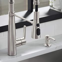 - Work like a pro in the kitchen. This KOHLER® semi-professional kitchen sink faucet with sprayer brings elegant design and exceptional ergonomics to home chefs. Designed as a commercial-grade faucet for home use, the deck-mount kitchen faucet sprayhead with push button lets you choose aerated stream for everyday tasks or Sweep® spray for powerful cleaning. Boost function increases the flow—great for tough cleanup jobs or for quickly filling pots and pitchers. Ideal for those interested in cooking, this modern kitchen faucet includes a matching soap/lotion dispenser. MasterClean™ sprayface of this pull down faucet features an easy-to-clean surface that withstands mineral buildup and maximizes spray performance. Single lever handle is simple to use and makes adjusting water temperature easy on this KOHLER kitchen faucet with sprayer. This single hole kitchen faucet includes top-filled soap/lotion dispenser. This KOHLER kitchen sink faucet with soap dispenser delivers 1.5 gpm (5.7 lpm) maximum flow rate at 60 psi (4.14 bar). Box includes: Assembled commercial sink faucet with sprayer, supply lines, escutcheon plate, soap/lotion dispenser.