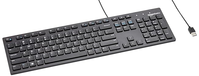 Amazon Basics Wired QWERTY Keyboard, Works with Windows, Plug and Play, Easy to Use with Media Control, Full-Sized, Black