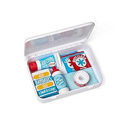 - Be prepared to respond to pretend play emergencies! The 25-piece Melissa & Doug Get Well First Aid Kit Play Set offers realistic accessories let little healers help the injured get well! Kids three and older can pretend to set breaks and sprains with a wrist cast, splint, and sling, clean wounds with wipes and gauze, bandage boo-boos, and soothe ailments with pretend play tube, spray bottle, eye dropper, and ice pack. A reusable activity card lets kids keep track of their diagnoses and treatments. All the pieces store in the snap-shut first aid box for easy cleanup. The play set is a fun and engaging way to ease any feelings of stress associated with medical visits, and to encourage nurturing and empathetic play. Spark a child’s creativity and imagination, and inspire young healers for years to come!