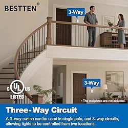 3 Way Decorator Switch: A 3-way switch can be used in single pole, and 3 way circuits, allowing lights to be controlled from two locations. 15A 120V/277V. Reminder: To match BESTTEN light switch color, please select USWP4 series wall plates High Quality: Crafted from impact-resistant polycarbonate thermoplastic and solid steel. A smooth, yet positive On/Off paddle action allows you to feel the quality in which every BESTTEN switch is made Easy Installation: Quick push-in and side wiring options available. Terminal screws accept up to 12 AWG and quick push-in wiring accepts 14 AWG solid copper wire only Elevate Durability: Full-rated current capacity with tungsten, fluorescent or resistive loads. Motor capacity is 80% of switch rating Sleek & Modern Design: The modern look of a decor switch can enhance the style of anywhere a switch is needed. Decor wallplate not included, gloss finish, UL certified