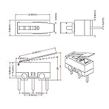 - Description: Specifications: Product Name: Micro Limit Switch Model No.: JL012-13.5-2 Contact Type: 3 Pins 1 NC 1 NO Product Certification: ROHS Electrical Characteristics: Insulation Resistance:≥500MΩ(Test between adjacent legs, pins and insulation resistance between the shell.) Voltage Tester:There is no insulation damage, and abnormal are (Input voltage AC300V(50Hz-60Hz) 1 minute, leakage current of 2mA,the test between the neighboring side.) Mechanical properties: Operating Force:70±20gf(Operation at the beginning of the vertical keys, the gradual application of force, surveying trip switch to reach all of the work required when the maximum operating efforts.) Itinerary:0.3±0.1mm(Operation at the beginning of the vertical keys, the volume of the top switch turn-on when the mobile distance or maximum distance.) Terminal Strength: Terminal without falling, fracture, loosening, such as abnormal(Terminals is any direction at the beginning of the force imposed by 0.5kg,duration 1 minute.) Reliability Test: Solder ability: Wetting pin area more than 95% Life expectancy: More than 500000 Welding heat-resistant test: Terminal part of invasive tin welding furnace, tin furnace temperature of 260±5℃, soldering time 2±1 seconds. Ontology without deformation, to meet in the machinery, electrical performance Package included: 20 x Micro Limit Switch AC 125V 1A 3 Pin