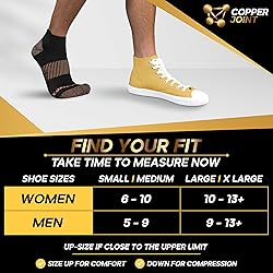 - CopperJoint Ankle Compression Socks are designed to deliver lightweight, everyday support in a low cut style that fits comfortably inside athletic shoes, work shoes, or casual footwear. Suitable for women and men, these ankle socks offer a balance of compression and comfort without the bulk of taller socks. Targeted arch compression helps provide a secure, supportive feel underfoot, while cushioned heel and toe zones add comfort and durability where you need it most. The breathable, moisture-wicking fabric helps keep feet cool and dry during workouts, long shifts, or daily routines. Copper-infused fibers help manage odor and maintain freshness during repeated wear. The snug, no-slip design helps keep the socks in place without bunching or pinching, supporting all-day comfort whether you are running, training, working, or relaxing. For best results, refer to the size chart and choose the size that matches your foot measurements. Proper sizing helps ensure a secure fit and consistent comfort throughout the day.
