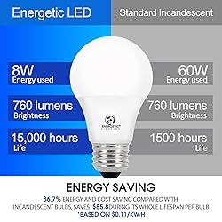 💡 Technical Features - 24 Pack, light bulbs 60 watt equivalent, 8W, 760LM, E26 base, 2700K soft white, non-dimmable, A19 shape, AC-120V, CRI 80, 180 degree, turn on instantly 💡 Energy Effient - These LED lightbulbs require less energy and can reduce costs on your energy bill. Each soft white light bulb works as a great replacement for old 60W incandescent bulbs 💡 Long-lasting - These bulbs are a great energy effient replacement for old incandescent bulbs because each lamp has a total lifespan of up to 15, 000 hours. You won't need to constantly change your light bulbs anymore 💡 Superior Light Quality - Non-flickering soft white light and zero harsh glares prevents eye fatigue and provides a comfortable, relaxed atmosphere.This bulb is perfect for your nightstand, living room, or dining room 💡 ETL/UL Certified - Our A19 LED bulbs are built with premium materials and circuitry, these 60 watt equivalent LED bulbs are certified by the rigorous safety standards of ETL/UL 💡 Not eligible for shipments to California.
