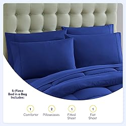 100% Soft Double Brushed Microfiber/Poly Filling OUTSTANDING 5 PIECE SET - Ready to update your bedroom decor? Get everything you need in one set! This soft and comfortable down alternative comforter set includes all you need to transform your bed into a home décor dream. In each pre-packaged set you will receive 1 all season brushed microfiber comforter, 1 fitted sheet, 1 flat sheet, and 2 pillowcases. Update your bedding with our Sweet Home Collection 5 Piece Bed in a Bag Comforter Set today! PERFECT FOR ALL SEASONS - We want you to be comfortable all year 'round. Having to pull out the old and heavy down comforter for winter is a hassle. We bring you a comforter that was designed for use throughout the year. Stay warm in the winter and cool in the summer. Our breathable, double brushed microfiber was designed with you in mind. Be comfortable and bring some flair today with this beautiful 5 piece set. LIE IN LUXURY – No more sleepless nights on uncomfortably itchy sheets! Sleep soundly on the softest microfiber sheets and down alternative comforter. They become softer with each wash and stay cool through the night. Be warned, though: You may never be an early bird again! HOW WE SIZE UP - Our comforter comes in five sizes, Twin, Twin XL, Full, Queen, and King size. King dimensions are as follows: Comforter: 102" x 88", Fitted Sheet: 78" x 80", Flat Sheet: 102" x 105", 4 Pillowcases: 20" x 36" Each STAY CLEANER, LONGER – Who has time to wash their comforter and sheets every few nights? When it’s time for a wash, machine wash cold, and tumble dry low.