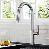 UNIVERSAL DESIGN: The Oletto Pull Down Faucet features a sleek contemporary look – DIMENSIONS: Kitchen Faucet Height: 16 5/8 in. – Spout Height: 8 3/4 in. – Spout Reach 8 7/8 in. – Swivels 360° for a full range of motion – Flow Rate 1.8 gpm PULL DOWN FAUCET SPRAYHEAD with Reach Technology offers maximum maneuverability, with an easy-retract hose and swivel adapter that enables a full range of motion so you can flex, pivot, and reach all around the kitchen sink DUAL FUNCTION KITCHEN FAUCET WITH SPRAYER: Switch between aerated stream and powerful spray – EASY-CLEAN NOZZLES: Soft rubber sprayer holes allow you to wipe away mineral build-up to help ensure long-lasting performance SPOT-FREE FINISH helps prevent water spots and fingerprints for a beautiful kitchen faucet with minimal cleaning, is not prone to corrosion, and is easy to keep clean SINGLE HOLE INSTALLATION allows you to install this pull down kitchen faucet with most kitchen sinks on the market – INSTALLATION-READY KIT includes pre-attached water lines, quick connect sprayer hose, snap-on counterweight, and mounting hardware