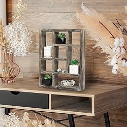[Freestanding or wall-mounted cubby display shelf] - Storage 9 compartments slots in various shapes and sizes to allow for versatile display options and eye-catching style [Rustic Home Décor Accents] - Handmade from premium hardwood, this hanging curio organizer will add a touch of unique rustic air to your room décor! Quality crafted with great attention to the slightest detail, it will make the centerpiece of your room, to inspire you and facilitate you in making the most stunning collectibles combinations! [Perfect Matching for] - Bedroom, Kitchen, Bathroom, Living room, entryway, front door, office, dresser, closet, foyer, hall, mudroom, gallery, diningroom, vanity, dorm, bookshelf. [Creating A Joyful Display Area] - Add a potted plant, mug, toy, key, purse, watches, photo, phone, candle, trophies, minifigures, glasses, rock, small decorations on top shelf to make the place an eye-pleasing spot [Can be oriented vertically or horizontally] - A versatile freestanding or wall-mounted shelf rack made of sturdy wood with a natural-style finish. No assembly required.