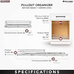 Cabinet Pullout Organizer: Upgrade your kitchen storage and keep your pots, pans, lids, and other kitchen supplies neat and organized with this sturdy sliding wire basket system from Rev-A-Shelf Storage Cabinet Organizer Specs: Dimensions: 20.5"W x 22"D x 5.56"H; Made with durable chrome wire construction and designed for a minimum cabinet opening for a face frame/ frameless cabinet of 20.5” W x 22” D x 6”H Flexible Kitchen Organizer: Features a full-extension ball-bearing system which slides smoothly; The 22” depth makes it perfect for maximizing the space in your cabinet; Durable and strong organizer that can be pulled all the way out of a cabinet Easy Install Kitchen Organizer: Comes fully assembled with simple (4) screw installation required; Includes basket and mounting hardware; Optional cabinet door mount kit is sold separately (5WB-DMKIT) Rev-A-Shelf Difference: A global family-owned company offering holistic, convenient, stylish, and smart organization and storage solutions for kitchens, baths, closets, and whole homes since 1984