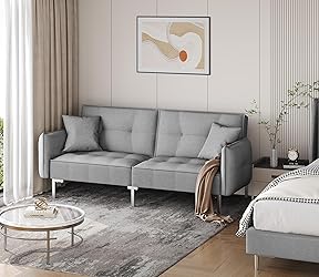 Specifications: Color: gray; Materials: linen, foam, metal, plywood; Seat height: 16.5”; Weight capacity (max.): 772lb; Overall dimensions: 105° sofa back angle: 78.3” L x 36.6” W x 33.3” H; 140° sofa back angle: 78.3” L x 40.6” W x 27.4” H; 180° sofa back angle: 78.3” L x 43.3” W x 25.2” H Sturdy plywood/metal construction: This heavy-duty living room couch bed is built of a robust frame with a quality furniture-grade budget-friendly plywood. Six 3cm/1" diameter strong metal legs to support the frame: i.e. 4 L-shaped legs on both sides plus 2 T-shaped legs in the center. The whole piece is capable of a weight capacity of up to 350kg/772lb. Worth-to-invest living room furniture: Made of high wear-resistant linen fabric and sturdy engineered wood frame, this convertible sofa bed is designed to last for years. Meeting both UK and US Flammability Standard, it gives you secured comfort besides the rest you need after a long day at work. Adjustable backrest design: The living room futon bed is designed with a versatile 3-position backrest angle adjustment. A 105-degree angle provides your back with a slightly reclined position regularly. A 140-degree reclining position might put the least stress on the spine. 180-degree flat lying position makes occasional couch sleeping commodious. Easy-to-adjust backrest angle: This living room convertible sleeper features an easy click-clack mechanism for backrest angle adjustment. You can adjust the 3 degrees (i.e. 105, 140 to 180 degrees) by simply folding the backrest forward first to unlock the degree setting, and then slowly unfolding it backward to set it at the reclining position that suits you. In seconds, it will convert into a recliner or bed just for you!