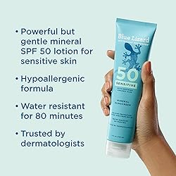 POWERFUL MINERAL SUNSCREEN - Protect sensitive skin from the sun’s harmful rays with Blue Lizard Sensitive Mineral SPF 50 Sunscreen Lotion it contains no harsh chemical active ingredients that might irritate sensitive skin. SPF 50 BROAD SPECTRUM PROTECTION - The water-resistant formula provides broad spectrum protection and helps protect skin from up to 98% of UVB rays. FORMULATED FOR SENSITIVE SKIN - Developed specifically for sensitive skin, the hypoallergenic formula is also paraben-free and fragrance-free. INFUSED WITH ORGANIC ALOE VERA - gently soothes and moisturizes. WE ♥ THE REEF – The reef-friendly formula is formulated without Oxybenzone or Octinoxate to help protect fragile reef ecosystems.