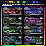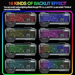 【Gaming Keyboard Mouse Combo】The gaming keyboard is made of aluminum alloy brushed panel, which is sturdy and durable. It can be waterproof a little, and the keyboard builts-in 4000mAh battery.The mouse builts-in 1000mAh battery ,eliminates the trouble of frequently changing batteries. No operation automatically sleeps within 5 minutes, any key wakes up 【2.4G Wireless Transmission】2.4G wireless technology enables the wireless gaming keyboard and mouse to achieve long-range wireless control. Plug & Play, the keyboard and mouse share an Intelligent Nano Receiver, convenient and fast. The gaming keyboard features a streamlined layout that is ergonomically designed for gaming or office or home use 【RGB LED Backlit Keyboard】The mechanical feel Backlit keyboard with RGB backlit effect is an excellent visual experience in night operation, pressing FN+DEL to switch backlight states, The keyboard can adjust backlight brightness and breathing frequency 【Fashionable and practical style design】Removable Hand Rest,game style floating keycap, with a variety of multimedia key combinations, two-color injection keycaps. The characteristic mobile phone bracket design on the keyboard can perfectly solve the problem of placing the mobile phone during the game, and can communicate more conveniently with the teammates when playing the game 【Gaming mouse】 The 7 color LED gaming mute mouse has a unique metal material roller, intelligent colorful light breathing light, 6-button button with the latest electroplated Electropland technology double flank, adjustable 4-speed DPI (800-1200-1600-2400), accurate positioning, touch Feel good, the game is more sensationa for mouse gamer.eyboard Dimensions: 17.9*6.8*1.7 inch,Mouse Dimensions:4.9*2.5*1.5 inch