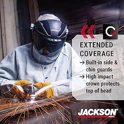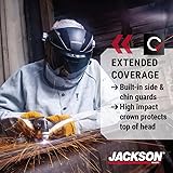 ABOVE THE NECK PROTECTION - Jackson Safety's Quad 500 Face Shield protects from non-ionizing radiation, chemical splashes, particles & debris; The ideal face protection for multi-purpose applications at work or at home EXTRA SIDE PROTECTION - Built-in side & chin guard offers additional face & lower neck protection while the extended crown protects against hazards from above OPTIMAL COMFORT - Wraparound anti-fog window for crystal clear panoramic views; 370 Speed Dial oversized knob easily adjusts headgear even with gloves on READY TO USE - Includes ratcheting headgear, crown, visor & window; Shade 8 flip-up visor delivers uninterrupted protection, ideal for cutting & brazing; Visor & window are designed with detents that conveniently lock in both the up & down position MEETS STANDARDS - Meets and exceeds ANSI Z87.1 and CSA Z94.3 standards; Meets OSHA requirements for face protection; Designed to be used with most goggles, respirators, and safety glasses
