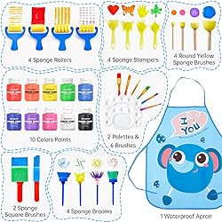 COMPLETE KIDS PAINT SET: Shuttle Art 37 pack kids finger paint set contains 10 colors washable finger paints in bottles (60ml/2oz each), and 1 kids apron, 2 palettes, 6 painting brushes, 4 roller sponges, 2 sponge shovels, 2 square sponge brushes, 2 round sponge brushes, 4 broom sponge brushes, 4 sponge stampers, complete toddler painting set for toddlers and young children. VERSATILE PAINTING TOOLS: We have prepared 23 pieces painting tools and accessories in this set like finger paint pad and paint brushes that kids can start paining as soon as they get it. Other assorted painting tools like sponge brushes, roller sponges give children more ideas to create and have fun. They can be immersed in it the whole day! WASHABLE & CHILD-SAFE: Our finger paint is water based, can be easily washed off from skins and other surfaces like desks, glass and fabrics. Conforms to U.S. ASTM D-4236 & EN71-3, non-toxic and acid-free, safe for kids. MULTY PURPOSE KIDS PAINT: Rich creamy paint with bright colors is perfect for kids finger painting, sponge and poster paint, and also can be applied on other surfaces, like paper, glass, wood, plastic, ceramic and more. Water-based paint can be easily washed off, great for school home activities, early learning and education. SERVICE GUARANTEE: Your satisfaction is our top priority, please rest assured to purchase our products. If you are not satisfied with our products or have any questions, please feel free to contact us at any time.