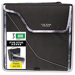 - LASTS ALL YEAR. GUARANTEED! Five Star 3" Sewn Zipper Binder Plus Removable Padded Case is made with durable material that helps protect your tech and study essentials. The removable padded case can store and help protect a Chromebook or other device up to 11" in size. 3" D-rings hold up to 700 sheets on 3 round rings, 5-tab expanding file holds up to 125 sheets and back pocket holds an additional 25 loose sheets of paper, for 850 total sheet capacity, when using 15 lb. filler paper. Removable, patent-pending multi-use strap converts to carry backpack or messenger style. Full zipper closure, carrying handle and convertible multi-use strap allow you to easily take all your essentials on the go. Binder measures 12-3/4" x 12-3/4" x 5". Available in Black/Gray. Guarantee is valid for one year from purchase or delivery date, whichever is longer. Does not cover misuse.