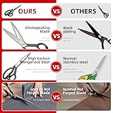 【Premium Tailor Scissors】The sewing scissors for fabric are made from high-carbon steel construction with anti-rust titanium coated very sharp blades, which are tempered and ground on both sides for increased sharpness and longer life, high-density steel makes 5 times harder and sharper than any other so-called "high quality" normal stainless steel sewing shears. 【Professional Sewing Scissors】Ergonomic soft-grip handle design for precision control and maximum comfort, the sewing scissors are weighted and balanced well to feel great in your hand, give you nice silky smooth cutting experience for years! 【Razor Sharp Fabric Scissors】All purpose heavy-duty industrial scissor make it easy to cut more than 32 layers of fabric, perfect for sewing, tailoring, quilting, dressmaking, cutting patterns, alterations, embroidery, art projects, handcraft, office and other everyday home uses, great for carpet, burlap, Leather, jeans, canvas, denim, patterns, paper, cardboard and many more. 【Dressmaker Fabric Shears】The traditional sewing scissors has been proved that the design is the best, every scissors are individually inspected and hand-tested to ensure the quality to meet your expectation, chamfering process on tailor scissors blade head avoids scratching clothes accidentally, the fabric shear come with a few lightly oil for long-lasting, you can wipe them down with a clean dry cloth before using your scissors.