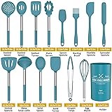 15 Pcs Silicone Cooking Utensils Kitchen Utensil Set - Umite Chef 446°F Heat Resistant Stainless Steel Handles Kitchen Gadgets Tools Set for Nonstick Cookware(Blue)