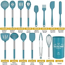 15 PREMIUM KITCHEN UTENSILS SET: 15 professional silicon Kitchen Utensil set includes slotted turner, solid turner, deep soup ladle, pasta server, flexible spatula, spoon spatula, spreader spatula, slotted spatula, bating brush, egg whisk, slotted spoon, solid spoon, kitchen tongs and holder. Meet your all kinds of kitchen needs STAINLESS STEEL & HIGH QUALITY SILICONE: Silicone head combine with High quality 18/8 stainless steel handle ensures daily use without broken. Designed not to bend, break or rust. Anti scalding silicone handle sleeve FOOD GRADE KITCHEN UTENIL SET: Our silicone utensils is made of all in best quality materials.You can also use all the appliances with confidence. We promise that our kitchen tools are 100% healthy for you and your family’s health DURABLE & HIGH TEMPERATURE STAND: All-around silicone added to the softness. One- piece stainless steel core to enhance durability and toughness to keep the spatulas from bending or deformation. Both the handle and silicone tops can withand high temperature to 446℉ (230℃), Effortlessly cook the foods you want, no longer worry food will stick your cookware steel material durable than wooden or bamboo, which prevent from chipping, warping or any other damages DISHWASHER: This quality kitchen silicone utensil set is easy to wash, simply wipe under hot water or throw them in the dishwasher. Please pay attention to clean after the first use and then store to prevent white stains after drying