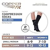 - Copper Fit Energy Unisex Crew Length Compression Socks provide superior support for your arch, feet and calves. The Energy Compression Socks reduce pain and swelling caused from prolonged sitting or standing. Equipped with a fully cushioned foot bed, these socks are built for all day comfort. Great for running, cycling, sports, hiking, travel, flights, pregnancy and every day wear. Make sure to order the right size - Small/Medium fits Men's shoe size 6-9 and Women's shoe size 7-10; Large/X-Large fits Men's shoe size 9-12 and Women's shoe size 10-13.