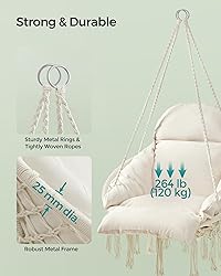 - Amid the hustle and bustle of everyday life, we often forget to take time for ourselves and relax. But even a brief respite can work wonders, particularly when enjoyed from a comfortable and cozy seat. So, pick a spot anywhere you want and create your own tranquil oasis to unwind with this hanging chair. Specifications: - Color: Cream White - Material: Steel, Polyester, Cotton - Product Height (Excluding Tassels): 44.5" (113 cm) - Seat Diameter: 23.6" (60 cm) - Armrest Ring Diameter: 31.5" (80 cm) - Product Weight: 11 lb (5 kg) - Max. Static Weight Capacity: 264 lb (120 kg) Package Contents: - 1 x Hanging Chair - 1 x Cushion - 1 x Steel Chain - 1 x Carabiner SONGMICS Notes: - The maximum static weight capacity of this hanging chair is 264 lb; do not overload it. - Keep the hanging chair from rain or long-term sun exposure. - Always check the stability of the hanging chair before use. - The hanging chair is a handmade item, and the rope can stretch during use. The stated dimensions refer to the product size before any use.