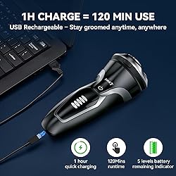 ➤No Pain Shaving: 3.7V motor provides up to 2900RPM power. 3D rotary razor with 4-direction floating head delivers more smooth, close and comfortable shave every time in low noise, you can enjoy painless shaving. ➤1 Hour Full Charge : Support USB quick full charge in about 60 mins and the electric shaver can work 120 minutes. It allow one-hand cordless operation and very convenient for your daily and long travel. ➤5 LED Display: Visible 5 levels battery remaining indicator on the shaver so you can check the remaining battery quickly and accurately before charging. No need to worry about the electric razor running out of power. ➤ Pop-Up Trimmer: Easy one-touch open tab to quickly trim unwanted facial hair and skin-friendly for shave a sideburns, beard shapes, mustache in seconds. ➤IPX7 Waterproof System: The whole body washable allows you enjoy a wet and dry shave even in the shower with foam or gel for an easier and better shaving experience. ➤A Best Choice for Your Father: Package included 1 electric shaver, 1 USB cable, 1 velvet pouch, 1 cleaning brush, 1 user manual; MAX-T electric shaver razor for men with exquisite appearance and advanced design is an ideal choice for father, husband, boyfriend and son for Christmas, Birthday, Valentine’s Day, Fathers’ Day or any other special occasion