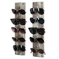[Stylish Sunglass Organizer] Decorative and attractive organizer for all type of eyewear. Hang and display your favorite daily sunglasses on this stylish wall mount wooden organizer in any room The rustic farmhouse style will compliment any room. [Perfect Space Saver] Make the most of unused wall space in your living room, bedroom, entryway, etc by hanging this sunglass organizer and storing your collections of sunglasses. Keeping your table clean and cluster free. [Functionality] Great way to store your eyewear, sunglasses, shades. It makes it easier to find the right glasses to match your mood and clothes on a busy morning. [High Quality] Made of High quality rustic real wood and stainless metal, that will keep all your eyeglasses safe for a long time. It is easy to install with the included hardware and once it is mounted to the wall, it will be placed securely in place without falling down. " [Dimensions] It comes at the perfect size of 16.93 x 3.85 inches with 5 metal hooks for placing your eyeglasses. Set of 2, each having 5 hooks to hang your eyeglasses, making most use of your space.