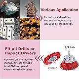 Safer to use than wire brushes, synthetic, chemical resistant Nylon Bristles are extremely safe and will not spark, corrode, rust, shed, puncture skin Nylon Brush kit is an All-Material-In-1, safe and easy light rust and paint remover and cleaner on most wet or dry applications like Metal, Steel, Stainless Steel, Wood, Aluminum, Plastic, PVC, Tiles, Stones and more Nylon cup and wheels abrasive brushes mounted on 1/4 inch Hex shanks, fits any drill or Impact Drivers What you get --- 10 pack nylon filament abrasive wire brush set including pen brush, flat brush, bowl brush.