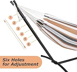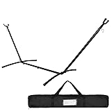 Strong Construction: The hammock stand is made with heavy duty steel frame. Crafted with sturdy materials, This solid hammock stand can hold up to 450 pounds(two average-sized adults). Black powder-coated finish, nice looking 9 FT Hammock Stand : This 9ft portable heavy duty hammock stand fits most Brazilian-style hammocks and provides a gentle rocking experience once set up. Please confirm your hammock length when purchasing this hammock stand SAFE AND ADJUSTABLE: U-shaped design at both ends, anti-sliding design. Fixed with knob, more firm, not easy to shake, more secure. There are 6 holes on the supports at both ends, and the height of the hook can be adjusted according to the length of the hammock SUITABLE FOR INDOOR OUTDOOR: This hammock stand can be placed in the bedroom, living room, or backyard, balcony. After a day’s work, it’s a great place to enjoy a release time EASY TO ASSEMBLE: Super easy to put the portable hammock stand together, connect the poles, tighten the knobs and install your hammock (not included), enjoy the leisure time with your children. Comes with a convenient carry bag, making it easy to transport and set up your hammock stand wherever you desire. Hammock not included