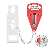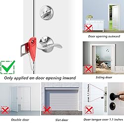 SECURITY AND PRIVACY : This portable door lock provides you with extra security and privacy, greatly improving your security and preventing unauthorized entry, so the door can't be opened from the outside, not even with a key; which is a great helper for you when you are on business and trips, or live alone EASY TO USE : Easy to install or remove, this door lock can be installed in seconds without any tools, even in emergency situations and in the dark. Just insert the metal piece into the slot of the door lock, close the door, and then put the red handle groove to the stud on the metal sheet, then no one can open the door from outside HIGH-QUALITY MATERIAL : The door security device is made of strong stainless steel. Rugged ABS plastic cover to prevent damage to doors under pressure. Steel surfaces with electroplating and polishing technology ensure a smooth touch and minimize any injury to your skin. A strong door lock with high quality may guarantee prolonged service life WIDELY USED : The security door stopper contains two holes of different sizes to ensure that all types of door locks are matched. Perfect for hotels, dormitories, apartments, short-term rentals, Airbnbs, bathrooms, bedrooms, or private rooms. It may also be applied to avoid pets going out, and also to prevent children from opening their doors to strangers COMPACT DESIGN AND TAILORED CUSTOMER SERVICE : Size 4.3 x 1.26 x 0.4 inches with 0.78 inch (2 cm) and 1.2 inch (3 cm) holes, lightweight and small, you can put it in a pocket or handbag. If you have any questions, please do not hesitate to contact us by email immediately