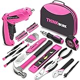THINKWORK 122-Piece Pink Tool Set with 3.6V Rotatable Electric Screwdriver, Home Tool Kit for Women with Easy Carrying Round Pouch, Ladies Pink Tool Kit for Home Maintenance, DIY, Gifts