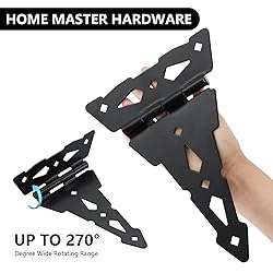 Enhance the look of your doors and gates with Home Master Hardware's 8 inch decorative T-strap hinges. The steel construction with black finish ensures durability and long-lasting use Our decorative T-hinges are versatile and suitable for right-hand or left-hand applications. We include screws for mounting, making installation a breeze Each hinge boasts a working load limit of 50 lbs, thanks to an offset screw holes design that prevents wood from splitting. Feel confident that your doors and gates will stay safely secured With a wide rotation range of up to 270°, our heavy-duty decorative T-hinge offers unparalleled flexibility. Use it for doors, gates, sheds, barns, garages, and more Your purchase includes 4 pack of heavy-duty decorative T hinges and 24 pcs of mounting screws hardware. Invest in Home Master Hardware's decorative T-hinges and upgrade your home's aesthetic and function Recommendations For Use:If the dimensions of your door are 72 inches in height and 36 inches in width, and the door weighs less than 100 pounds, we recommend using two hinges for installation. If any of the dimensions or weight of your door exceeds these standard door dimensions, we recommend adding one or two additional hinges based on the actual situation to ensure a more secure installation