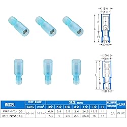 - Specifications: Color: Blue Material: Brass + Nylon Terminal Type: Fully Insulated Nylon Female / Male Bullet Connectors Wire Range: AWG 16-14 / 1.5-2.5mm²; Max current=15A Heat Resistant: -40 - 105℃ Maximum Voltage: 300V Plating: Tinned Package Include: Total 100pcs in the package - 50 Blue Male Bullet Connectors - 50 Blue Female Bullet Connectors Connection Steps: 1.Strip the two wires and insert it into the female/male connector separately. 2.Use a professional crimping tool to crimp the connectors. 3.Finished the wire connection.