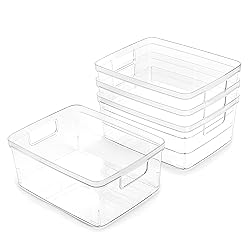 Expertly Designed: Our pack of 4 clear storage bins is expertly crafted for functionality and convenience. THE LUCID COLLECTION features BPA-free plastic organizer bins with smooth cutout handles on both sides for easy lifting, sliding, and transportation. Our small clear organizers also have rounded corners with elevated bottoms on four edges. Space-saver: Pantry organization and storage just got much easier with our space-saving clear plastic bins. Designed for easy storage organization, our durable, sturdy, leakproof storage bins for the pantry, kitchen, and fridge help arrange your home goods and essentials for a tidy, clutter-free space. The see-through sides of our plastic bins also make it quick to find your stuff with a glance. Multipurpose Bins: THE LUCID COLLECTION is a fantastic fridge organizer collection for sorting vegetables and produce. These clear bins for organizing items can also help save space just about anywhere. Let our clear plastic storage bins do the work for you. They are versatile enough to be used as a bathroom organizer for toiletries, medicine storage bins, plastic containers for arts/crafts supplies, toys, and holiday decorations. Have them as handy containers for closets, garages, and more! Shatter-resistant: Our BPA-free plastic organizer bins are made of shatterproof material, which protects your home and kitchen goods or essentials against damage from accidental falls. THE LUCID COLLECTION clear organizing bins make a great gift idea for many occasions, such as Thanksgiving, housewarming events, weddings, Christmas, or just a casual present you want to share with your family and loved ones. Useful in Small-spaced Homes: When a refrigerator and pantry do not have enough storage space, our plastic bins offer a practical solution. These durable storage bins are a smart and stylish way to organize small spaces in homes, and they won't take up too much space. Our square storage bins measure 10"x 8"x 4.25"to accommodate many items.
