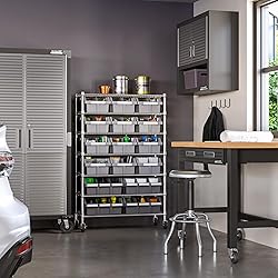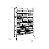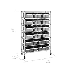 - Organize your space with the Seville Classics 7-Tier NSF 16-Bin Rack. This heavy-duty bin rack organizer is constructed from commercial-grade steel and measures 36” W x 14.25” D x 56” H (53” high on leveling feet). The seven steel wire shelves and four steel poles/posts (1” diameter) are coated in a durable powder-coated finish for protection against corrosion in dry environments. For easy access to items, our patented design features 16 high-impact polypropylene (HIPP) bins (4 X-Large and 12 Large), each made of 20% post-consumer recycled content. Featuring four 3” heavy-duty rubber wheels (two locking) and includes four bonus adjustable leveling feet. This bin rack system is versatile ranging from home offices, laundry rooms, living rooms, garages, art studios, craft rooms, warehouses, businesses, offices, kitchens, restaurants, mail rooms, and schools.