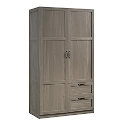 - From traditional clothing storage to kitchen pantry optimization, this wardrobe cabinet from the Sauder Select collection is sure to provide the perfect solution. This large clothing armoire features storage behind a full-length door that includes a garment rod and fixed shelf for storing button-down shirts, sweaters or dress pants in the bedroom or jackets and winter coats in the utility room. Additionally, this armoire with hanging rod includes one fixed and one adjustable shelf behind the right door for customizable storage space that's ideal for towels or toiletries in the bathroom. This space is also well-suited for organizing bins and baskets, to provide general storage for toys, games or movies in a family room or living room. This wardrobe armoire also includes two deep storage drawers that glide on metal runners, an excellent spot for office supplies. Finished in a cool Silver Sycamore™, stylish and functional storage for the bedroom, mud room, or just about anywhere is just a click away.