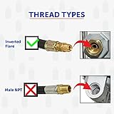 Allows removal of an empty cylinder for refill without interrupting the propane supply For RVs with dual propane tanks, it automatically switches from the primary tank to the reserve tank when the primary is empty UL LISTED: Inlets are 1/4" SAE inverted flare, and the outlet is 3/8" NPT female pipe thread; rated for 345,200 BTU Double-stage design maintains constant gas pressure under changing demand and conditions; the regulator is factory set at 11" WC (water column); lockout pressure is up to 14.9" WC Compatible with Flame King's 48-inch Thermo Plastic Hose (Model 100383-48) and 12-18 inch INVERTED FLARE Pigtails (Models E12INPT, E15INPT, or E18INPT) For your safety and to ensure leak-free performance, these regulators are assembled using high-strength thread-locker (Loctite) on the adapter connections where the pigtails are attached. This is an intentional safety measure designed to keep critical fittings secure and prevent gas leaks during use. Note: NPT pigtails are not recommended.