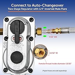 - The Auto-Changeover LP Regulator allows you to hook up to 2 Propane tanks. The regulator automatically switches over to the second tank once the first one runs out (and vice versa). The indicator changes color to let you know when a tank has been depleted and needs to be refilled. The inlet is a 1/4" SAE inverted flare, and the outlet is a 3/8" NPT female pipe thread; rated for 345,200 BTU. Compatible with Flame King's 48-inch ThermoPlastic Hose (Model 100383-48) and 12-18 inch INVERTED FLARE Pigtails (Models E12INPT, E15INPT, or E18INPT). Note: NPT pigtails are not recommended. For your safety and to ensure leak-free performance, these regulators are assembled using high-strength thread-locker (Loctite) on the adapter connections where the pigtails are attached. This is an intentional safety measure designed to keep critical fittings secure and prevent gas leaks during use.