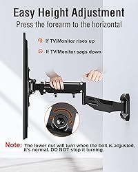 TV Wall Mount Compatibility-This full motion TV wall mount fits most 26-55 inch TVs and large monitors/computers, with vesa patterns range from 100x100mm(4x4”) to 400x400mm(16x16”) and holds 11-66 lbs. Please Check TV weight, size, vesa, and input access before purchase. Optimised Viewing Experience - The TV Mount can easily tilt flat or curved screen 5° up and 15° down to reduce glare, swivel the TV left or right 90° according to your seat. Pull out to 23.11” and retract back to 2.36”, and has +3°/-3° screen level adjustment capability. It gives you the maximum flexibility in positioning your TV to fit your environment for a comfortable view. Safety & Stability - This full motion TV mount made of heavy-duty aluminum and steel for reliable strength. The wall mount TV bracket has been strength tested ensure to hold the TV stably. Quick & Easy Installation -TV mount with a step-by-step graphic installation instruction and full range of hardware and is easy to install in 15 minutes. Note: This wall mounts are perfectly for wood stud and concrete wall but NOT for drywall alone. Do Not install onto drywall alone. Concrete anchors will be sent per request. Smooth Height Adjustment – Easily raise or lower your screen for ergonomic comfort in any setting. Do not adjust the tension of the gas spring while it is in the unloaded state. The product is factory-set to minimum tension; excessive adjustment may cause component damage.