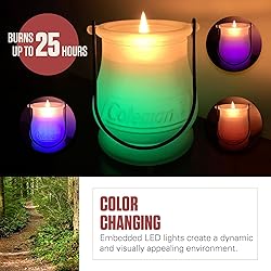 - Set the perfect ambiance for any outdoor gathering with the Coleman Color Changing LED Citronella Candle. This beautifully designed citronella candle features a sturdy glass holder, giving it an elegant look while also protecting the flame. The unique, color-changing LED lights embedded within the candle provide a captivating display, creating a vibrant, festive atmosphere as they illuminate the entire candle with a spectrum of colors. Not only does this citronella candle add charm to your outdoor spaces, but it also has a pleasant citronella scent, ensuring a more comfortable and enjoyable environment. With an impressive 25+ hours of burn time, this candle is a reliable companion for long evenings in the backyard, during camping trips, or any outdoor activity. The convenient metal handle makes it easy to carry or hang, offering versatile use whether you’re lighting up your patio or enhancing your campsite. The Coleman Color Changing LED Citronella Candle combines functionality with fun, creating a magical outdoor experience that everyone will enjoy.