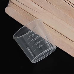 50 pack 30ml plastic graduated cups transparent scale cups with 50 pack wooden stirring sticks. 50 pack wooden stirring sticks,each measures approx 11.2 * 1 * 0.2cm/ 4.4 * 0.4 * 0.08" (L*W*T),good for mixing small batches. These cups made of solid polycarbonate plastic,strong and non - fragile,flexible and not easy to crack,easy to read external measurements;stirring sticks are made of original wood. The cup has accurate laboratory markings in 30ml, reusable and easy to clean,clear plastic allows good visibility into your container. These cups are suitable for taking liquids, dry pills, and powder dosage forms, but also for use in cooking measuring cups or laboratory measuring liquids.
