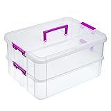 Stack carry box is 2 tiers with handle for best use of space, buckle latches is detachable, we could use it to lock your supplies for safe storage, or use the layer independently to fit individual needs. Storage box has a carry handle on the top so you can latch the two boxes together and move them around all at once. Storage container with transparent design, you can clearly see what is in the box easily and find where they are stored, eliminating the hassle of opening the box. Overall dimension is about 14-1/4" x 10-1/2" x 7-5/8". Light weight and easy to transport and carry. Perfect for collecting all small things, such as bobbins, small toys, beads, jewelry, beauty products accessories, scrapbooking supplies, sewing supplies, art supplies, nail polish and so on.