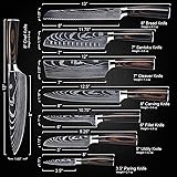 🔪【Masterfully Forged】from Premium High-Carbon Stainless Steel, the Imperial Collection is built to last so that you will never need another set of kitchen knives again. 🔪【Complete 8 Piece Collection】The Imperial Knife Set includes the 8 most important knives you will need in the kitchen - Chef's Knife, Santoku Knife, Bread Knife, Paring Knife, & more. 🔪【Beautiful Damascus Pattern】Each knife is laser-etched with an elegant Damascus pattern and has an smoothly-finished wooden handle. 🔪【RUTHLESSLY Sharp】Each knife is carefully heat-treated and sharpened to perfection for razor-sharp cutting and extreme durability. The knives allow for extremely thin slicing and impeccable chopping. 🔪【Luxury Gift Box】The Imperial Collection comes in a beautiful gift box that allows for easy gift giving and serves as storage for your knives.