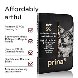 - Prina 50 Pack Professional Graphite Charcoal Drawing Supplies Pencils Set, Artists Sketch Pencils kit Perfect for Beginners Teenagers Experienced Graphic Designers and Kids Product Details:· Include 3-Color Sketch Pad,6" x 9", 50 Pages· Precision, Pre-Sharpened Lead· Perfect for Details, Blending and Shading· Convenient Carrying Case, Travel-Friendly· Beginner or Professional· Premium Non-Slip Grip Pencils· Sketch, Draw, Color and BlendPackage Includes:15 Wooden Graphite Sketch Drawing Pencils, Lead Core Range of Hardness And Softness (12B,10B, 8B, 6B, 5B, 4B, 3B, 2B, B, HB, F, 2H, 3H, 4H, 5H )1 Drawing Pad With 3 Colors Sketch Paper, 50 Pages,6X9 Inches3 Black Charcoal Pencils (Soft / Medium / Hard)3 White Charcoal Pencils (Soft / Medium / Hard)1 Woodless Graphite Pencil (6b)6 Soft Pastel Sticks 4 Charcoal Willow Sticks3 Charcoal Sticks (Soft / Medium / Hard) 3 Graphite Sticks (Soft / Medium / Hard) 3 Paper Blending Stumps 1 Double-Headed Pencil Extender1 Sandpaper Block2 Erasers: Vinyl Eraser and Kneaded Eraser2 Sharpeners:1-Hole and 2-Hole1 Metal Art Knife1 zip-up case