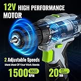 Efficient & Lightweight: This 12 V cordless drill delivers 20 N.m max torque, designed with variable 2-speed settings (0-400 rpm and 0-1500 rpm) for drilling and fastening application on the job site or at home. WORKPRO lightweight drill is built especially small and compact (only weighs 1.8 lb), so it can be easily used in tight spaces 18+1 Adjustment Torque: Features 18+1 torque position clutch, providing more precise torque adjustment as needed, so you will always have the power you need. A 3/8 inch keyless ratcheting chuck can hold most bits and is ideal for general-purpose drilling Ergonomic Design and LED light: The anti-slip soft rubber handle is comfortable, and the compact design fits nicely in your hands for working a long time without getting tired. The trigger-delay LED work light stays on for ten seconds after you’ve let go of the trigger, it's useful in dark basements or underneath a vehicle 61 Pieces Household Tool Kit: It contains almost every basic hand tool you need for work or DIY projects around your apartment. The 14 inch storage tool bag is made from 600 D polyester fabric, providing durability and reliability; featuring an open wide mouth for easy organization and access.12 V Cordless drill with a tool kit is perfect as a starter set and also ideal gift for your dad, boyfriend, son, or business partner High Quality & Affordable Drill Kit: 12 V Cordless Drill Driver with 1*1.5 Ah Lithium-ion Battery, 1*Charger, 1*Utility Knife, 10*Utility Knife Blades, 10*HSS4241 Drill Bits, 1*60 mm Bit Holder, 32*CR-V Screwdriver Bits,1*6 inch Slip Joint Pliers, 1*6 inch Adjustable Wrench, 1*8 oz Fiberglass Claw Hammer, 1*10 Ft (3 m) Tape Measure, 1*Torpedo Level, 1*14-inch Storage Bag