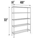 Made for commercial, retail and industrial dry storage. Heavy duty construction. NSF Includes: 5 shelves with shelf clips and 4 posts with leveling feet. Shelves can be adjusted in 1” increments along posts to fit your unique storage needs. Each shelf can support 270 lbs evenly distributed No tools required. Can be assembled in minutes. Open wire design reduces dust and dirt from accumulating