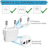 SAFE & RELIABLE: Our European plug adapter is of safe pure copper conductor and ABS flame-retardant material. No deformation, with strong elasticity, to put an end to safety risks. Voltage current: 6A/125~250V. Maximum power: 600 W. EASY TO CARRY: European plug adapter power converter is small and lightweight for luggage and a briefcase for travelers and businessmen. It is the perfect choice for travel. WIDE RANGE: Will fit all European outlets including the modern Hexagon outlets. They work in Germany, France, Spain, Portugal, Sweden, Norway, Belgium, and the Netherlands to name a few. And also work great in both Italian and Swiss sockets! MULTI-PURPOSE: These travel adapter Europe are very small electrical adapter plugs that can be used to charge smartphones, Bluetooth speakers, razors, power boxes, laptops, tablets, and more. WHAT YOU GET: 6 Pack European Plug Adapter (White), our 7*24 friendly customer service for peace of mind.