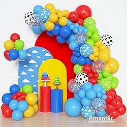 Amandir 152Pcs Blue Red Yellow Balloon Arch Garland Kit, Different Sizes 12 10 5 Cow Cloud Pattern Green Confetti Latex Balloons For Cartoon Theme Birthday Baby Shower Decorations