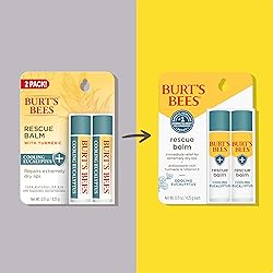 RESCUE LIP BALM: One package contains two 0.15 oz. lip balm tubes of Burt's Bees Rescue Balm in Cooling Eucalyptus to hydrate and repair severely dry lips LIP MOISTURIZER: Made with double the waxes and butters of Burt's Bees Ultra Conditioning lip balm, Rescue Balm instantly hydrates, repairs and promotes healing for severely dry, chapped lips WITH TURMERIC: Each balm is infused with antioxidant-rich turmeric to nourish dry, chapped lips when used every 4 hours CONDITIONING LIP THERAPY: The tint-free tube of moisturizing lip balm glides on your lips smoothly, leaving them smooth and refreshed with a matte finish from natural ingredients NATURAL ORIGIN: Formulated without parabens, phthalates, petrolatum or SLS, this 100% natural lip balm revitalizes and beautifies your lips with clean ingredients to moisturize worry-free ON-HAND LIP CARE: Easy to tuck into a pocket or store in a purse, this natural lip balm is the perfect lip treatment for summer, winter, fall and spring weather