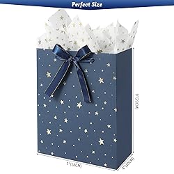 - 🎁Blue bow design Size & Quantity Gift bags set:7" L x 4" W x 9" H, total 4 pcs bags Gold star tissue paper:19.5"X27.5", 4 pcs High-quality:These Eco friendly paper bags are made of 250GSM cardboard. Widely use:The best choice for holiday,parties,birthdays,weddings,fathers day,thanksgiving day, christmas,valentines, easter,graduation,retirements anniversary,product store and other multi-purposes. Tips:According to the size of your product, choose our suitable gift bags.