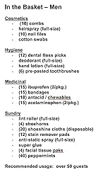 - Emergencies happen to the guests too! Don't let your guests leave your event because of a fashion cosmetic or minor medicinal emergency. In The Basket utilizes name-brand products and comes in a beautiful brown wicker basket. Great for any formal event. Our amenity baskets are designed to answer the needs of both genders. For the convenience of your guests we prepare the baskets in configurations to fit any size group or occasion. Your gentlemen guests will surely appreciate having these items in their restroom. They might not think to have a basket for the men but will be glad you did. Great for Weddings - Showers (Bridal/Baby) - Corporate Events and anywhere a group of people might meet. in the basket - men - amenity basket is for more than 50 guests. Contents change based on the size of the amenity basket and availability of the brand of products. See product description for list of contents. Returns - exchanges made on unopened product only due to hygienic contents. The contents of this basket include: (10) combs - hairspray (full-size) - (10) nail files - cotton swabs - (12) dental floss picks - deodorant (full-size) - hand lotion (full-size) - (6) pre-pasted toothbrushes - (12) ibuprofen (2-pkg) - (15) band-aids - (10) stop poop stuff (1-pkg) - (14) antacids - (12) Extra Strength Tylenol (2-pkg) - lint roller (full-size) - (4) shoehorns - (14) shoeshine cloths (disposable) - (12) Shout stain remover pads - super glue - (4) facial tissue paks - (50) mints.
